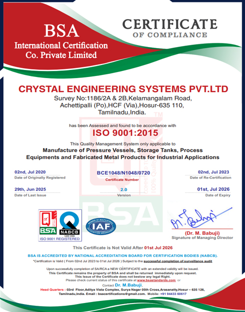 Established in 2000, Crystal Engineering Systems is a trusted name in the manufacturing of pressure vessels, storage tanks, process equipment, SS RO/blending skids, FRP driver desks, and heavy custom-built systems. We serve a broad spectrum of industries with tailored engineering solutions — always honoring commitments and exceeding expectations. Every product is custom-designed to meet specific client needs, with a strong focus on quality, precision, and timely delivery